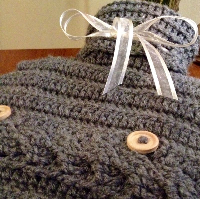 Deze gehaakte kruikenzak is gemaakt met kabeldetail, lint en houten knopen om de zak te sluiten.